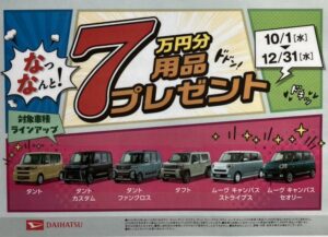 2025年9月9日 / 最終更新日時 : 2025年9月9日 池子自動車 イベント ダイハツフェア いいこと秋祭、只今開催中! 「ダイハツフェア いいこと秋祭」を開催しております!ご来店で、カット式台フキンを皆さまにもれなくプレゼント(無くなり次第終了)いたします!さらに抽選で、合計200名様に豪華プレゼントをご用意しております!皆さまのご来店をお待ちしております!