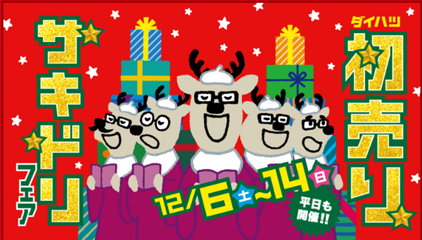 2025年12月6日 / 最終更新日時 : 2025年12月6日 池子自動車 イベント ダイハツ初売りサキドリフェア開催のお知らせ 12月6日から14日までの9日間【ダイハツ初売りサキドリフェア】を開催いたします!フェア期間中にご来店いただいたお客様には生活応援ギフトセット『キッチンニシカジカ』と『アイラップ』を抽選でどちらかをプレゼントいたします! さらに、Wチャンスで『近江牛&神戸牛ビーフすきやき食べ比べセット』や『福岡 博多華味鳥 もつ鍋セット』などが抽選で当たります! 是非、ご来店ください! プレゼントは数に限りがございますので、何卒ご了承願います。