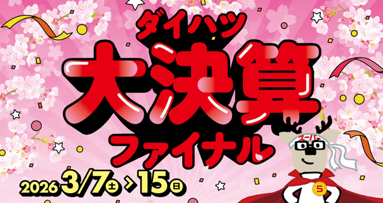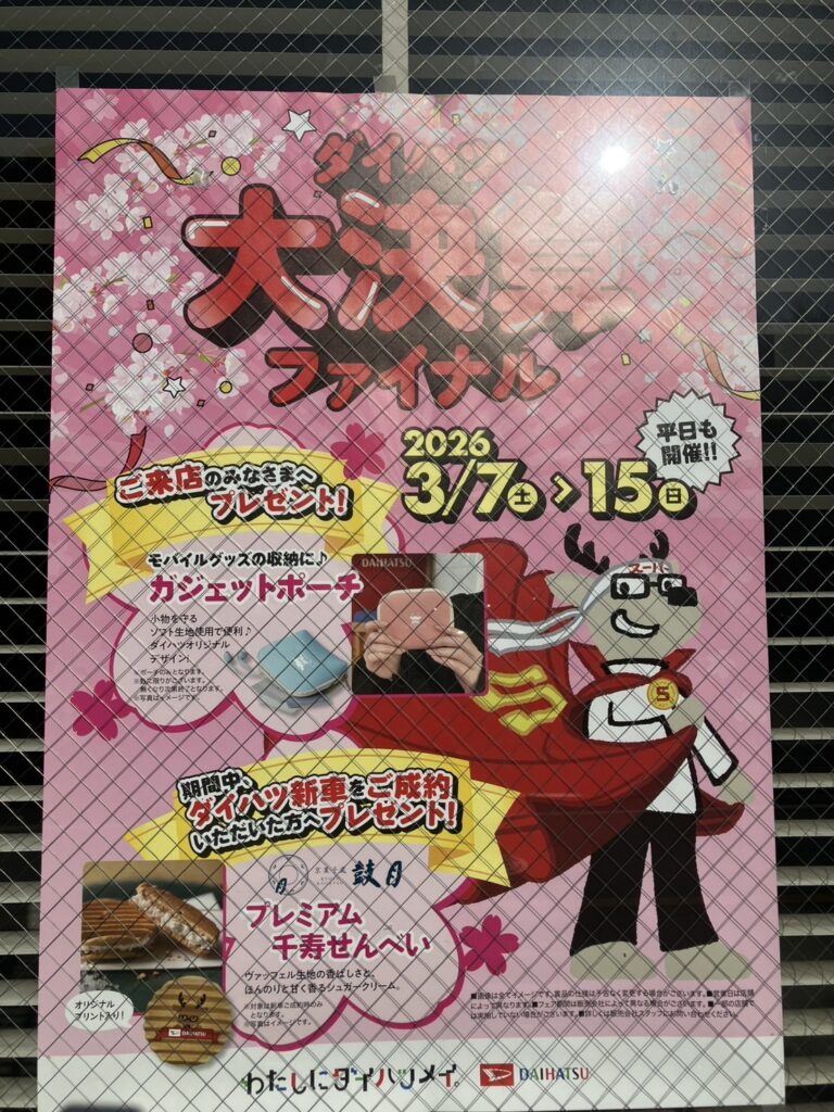 2026年3月7日 / 最終更新日時 : 2026年3月7日 池子自動車 イベント ダイハツ大決算ファイナル開催中!(2026/3/7-15) ご来場特典やご成約特典が充実の「ダイハツ大決算ファイナル」を開催中! ご来店のみなさまへ、モバイルグッズの収納に便利な、「ガジェットポーチ」をプレゼント! また、期間中にダイハツ新車をご成約いただいた方へ、京菓子處 鼓月の「プレミアム千寿せんべい」をプレゼント! 是非、ご来店ください! ※プレゼントは数に限りがございますので、何卒ご了承願います。