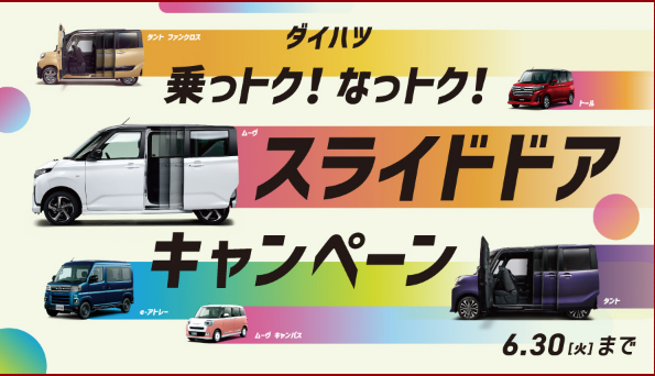 2026年4月9日 / 最終更新日時 : 2026年4月9日 池子自動車 キャンペーン 乗っトク!なっトク!スライドドアキャンペーン実施中! 期間中、スライドドア車にご試乗いただくと、ヘッドレストに装着できるBOXティッシュをプレゼントしております!さらに、豪華景品が当たるWチャンスもご用意しております!期間は6月30日(火)まで!大人気のスライドドア車を、ぜひご体感ください!