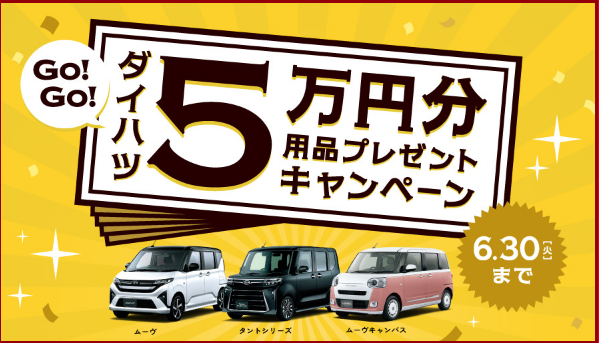 「タント・タントカスタム・タントファンクロス・ムーヴ」限定で、用品5万円分プレゼントキャンペーンを開催しております!